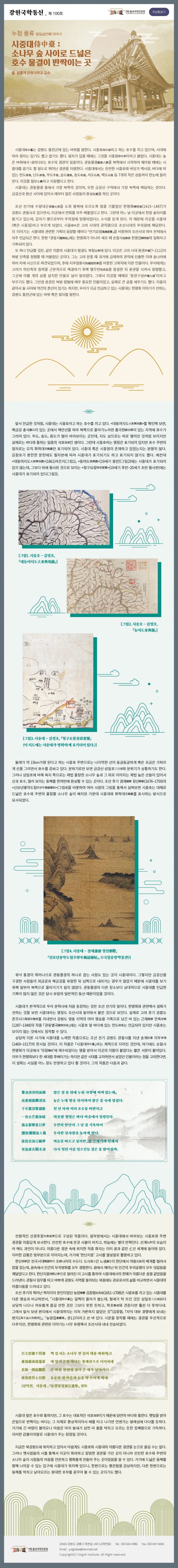 [누정 풍류] 17. 시중대侍中臺 : 소나무 숲 사이로 드넓은 호수 물결이 반짝이는 곳 페이지 정보 작성자 : 율곡연구원 | 조회수 : 44회 작성일25-09-24 09:04 본문 감사합니다. 목록